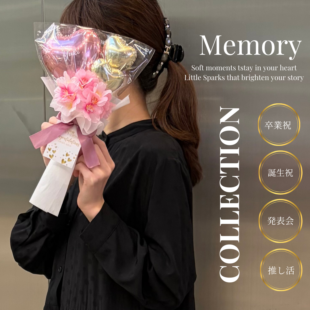 Memory(メモリー)は、心にそっと残る“やさしい思い出”をテーマにした、上品で可愛らしいハートアレンジ。まるで大切な記憶を包み込むような、誕生日、発表会、推し活、お礼ギフトにもぴったりな万能で愛らしいアレンジ。