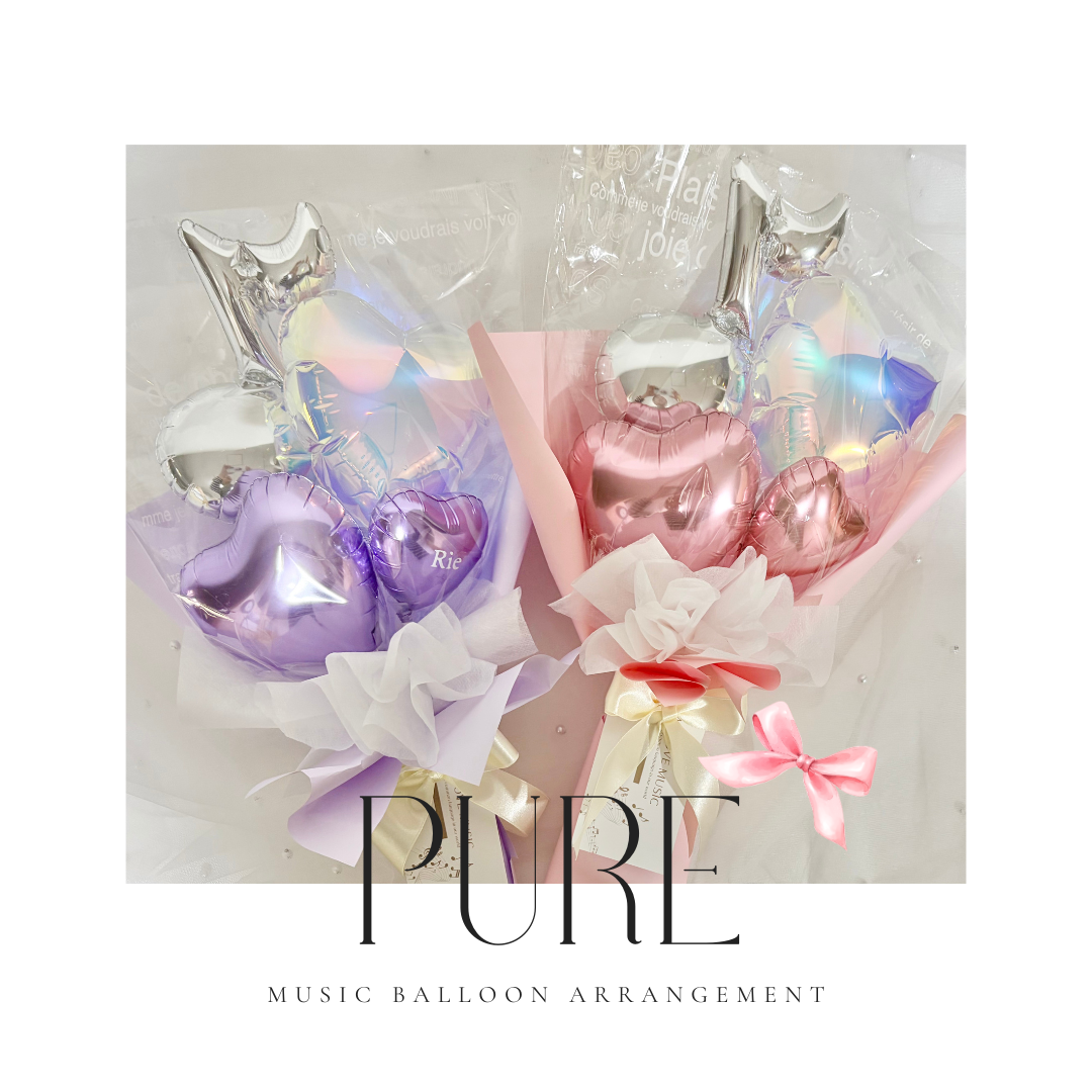 オーロラのように輝くアクア素材の音符バルーンを使用しています。ラベンダーやピンクの他、ライトブルーやライトグリーンにも対応可能です。光の角度で色味が変わる透明感のあるデザインがガーリーな雰囲気を演出します。
