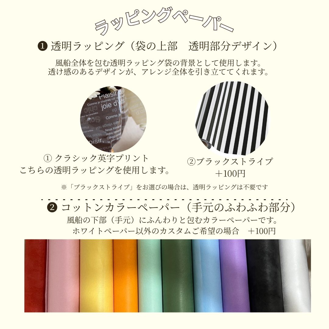 自由度の高い組み合わせができる柔軟なアレンジで、好みに合わせたデザインが楽しめます。透明ラッピングなので、会場でも華やかに映えます。プチギフトとして特に人気が高く、演奏会や記念日の贈り物にもおすすめです。