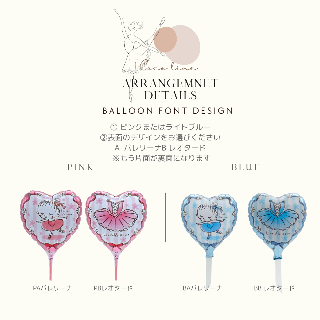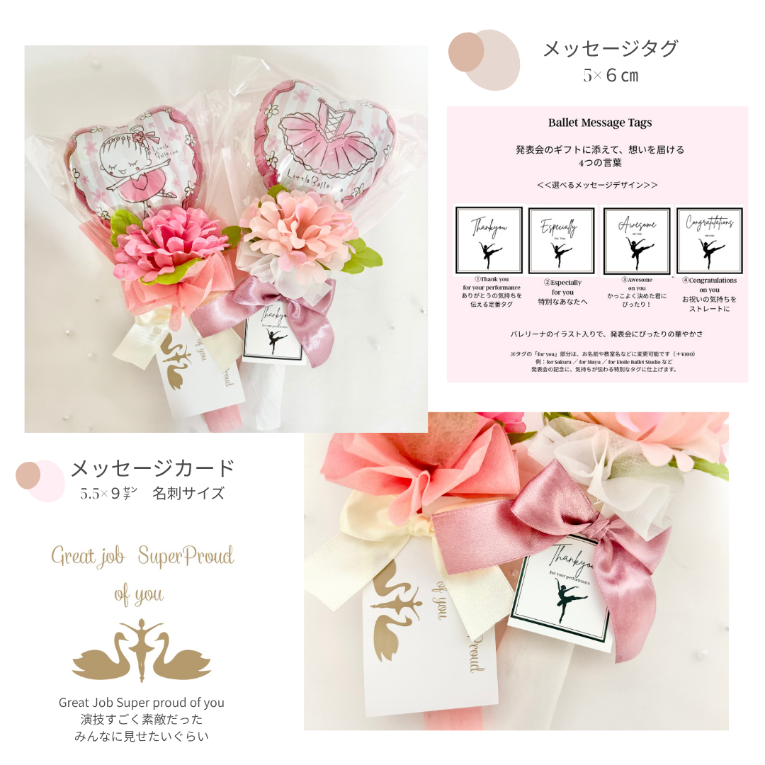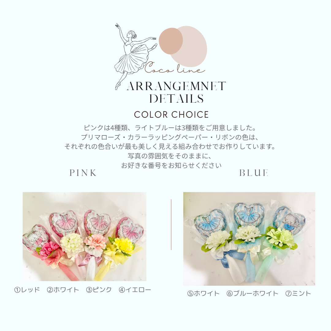 さりげない贈り物として取り入れやすく、発表会にふさわしい特別感のあるアレンジ。リバーシブル仕様のバレエモチーフバルーンが、表裏で異なる上質な印象を楽しませてくれます。ラッピングはフラワーリース柄の透明デザインペーパーを使用し、お手元にはふわふわラッピングペーパーを使用。