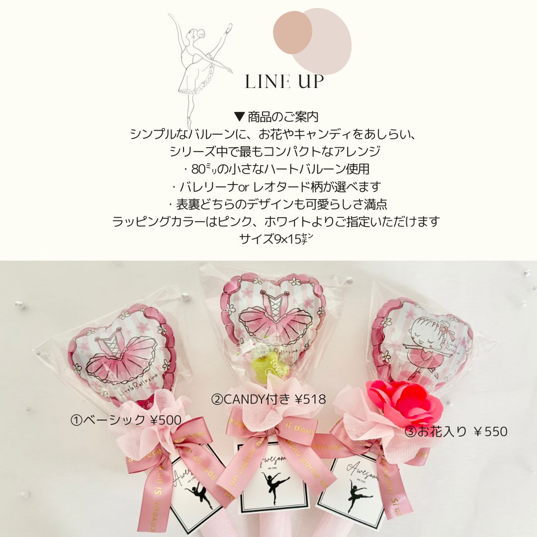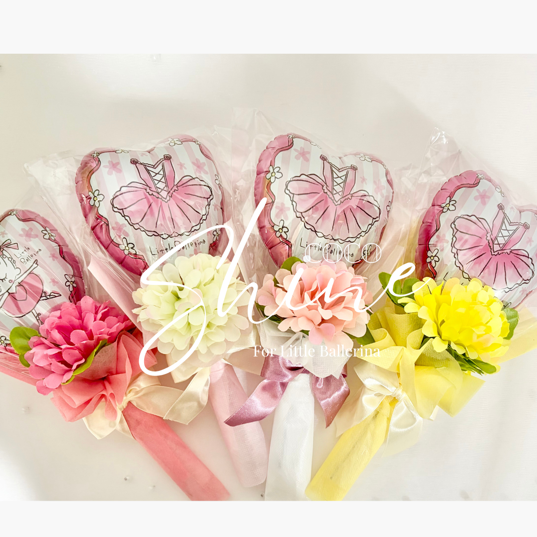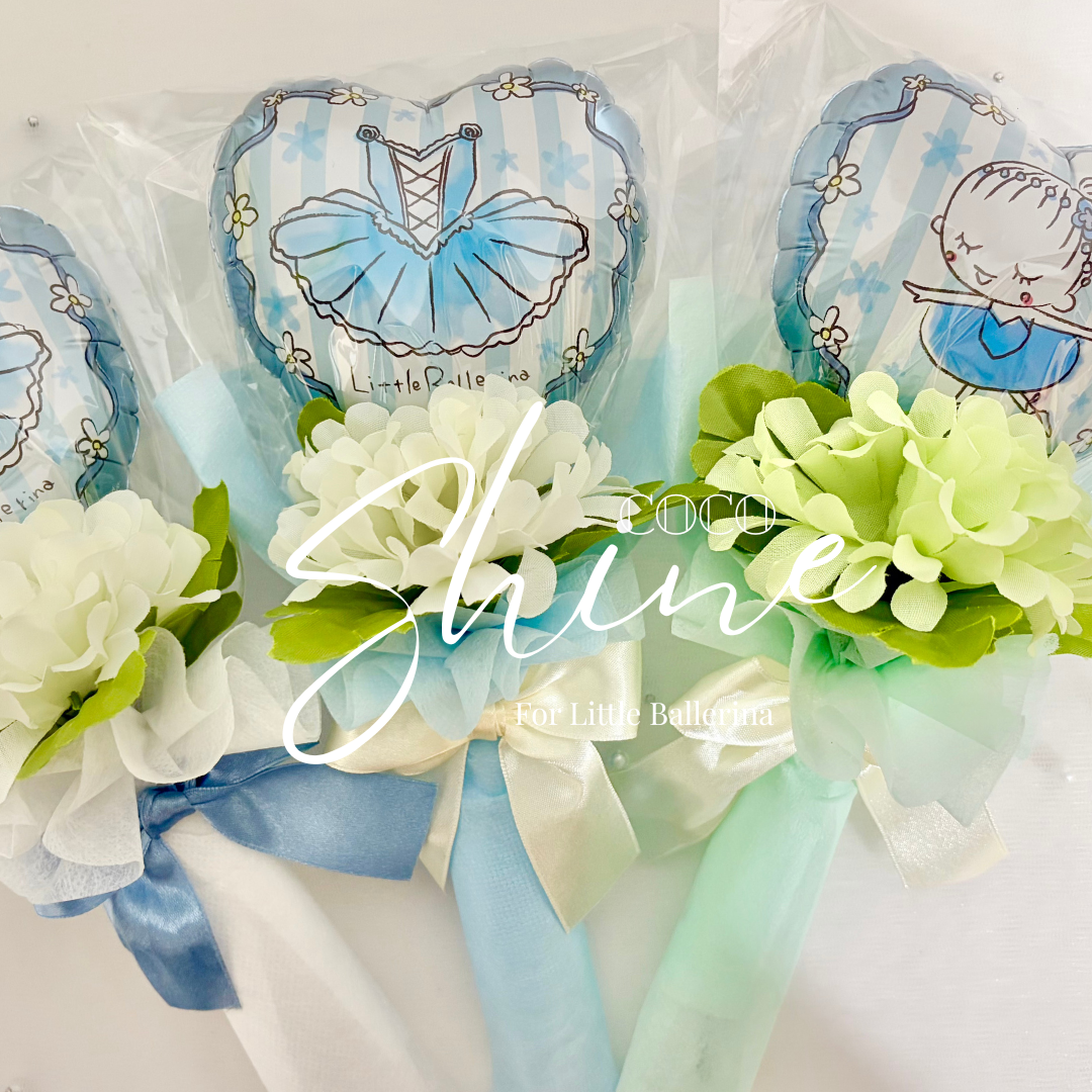 さりげない贈り物として取り入れやすく、発表会にふさわしい特別感のあるアレンジ。リバーシブル仕様のバレエモチーフバルーンが、表裏で異なる上質な印象を楽しませてくれます。ラッピングはフラワーリース柄の透明デザインペーパーを使用し、お手元にはふわふわラッピングペーパーを使用。